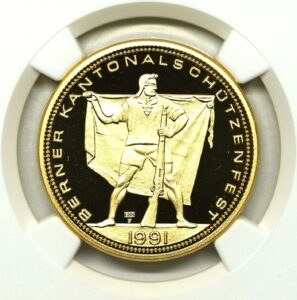 1991年 ベルン(ランゲンタール) 射撃祭 1000フラン金貨 ピエフォー PF69UCAM NGC