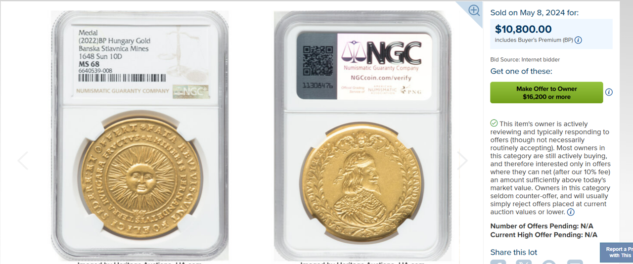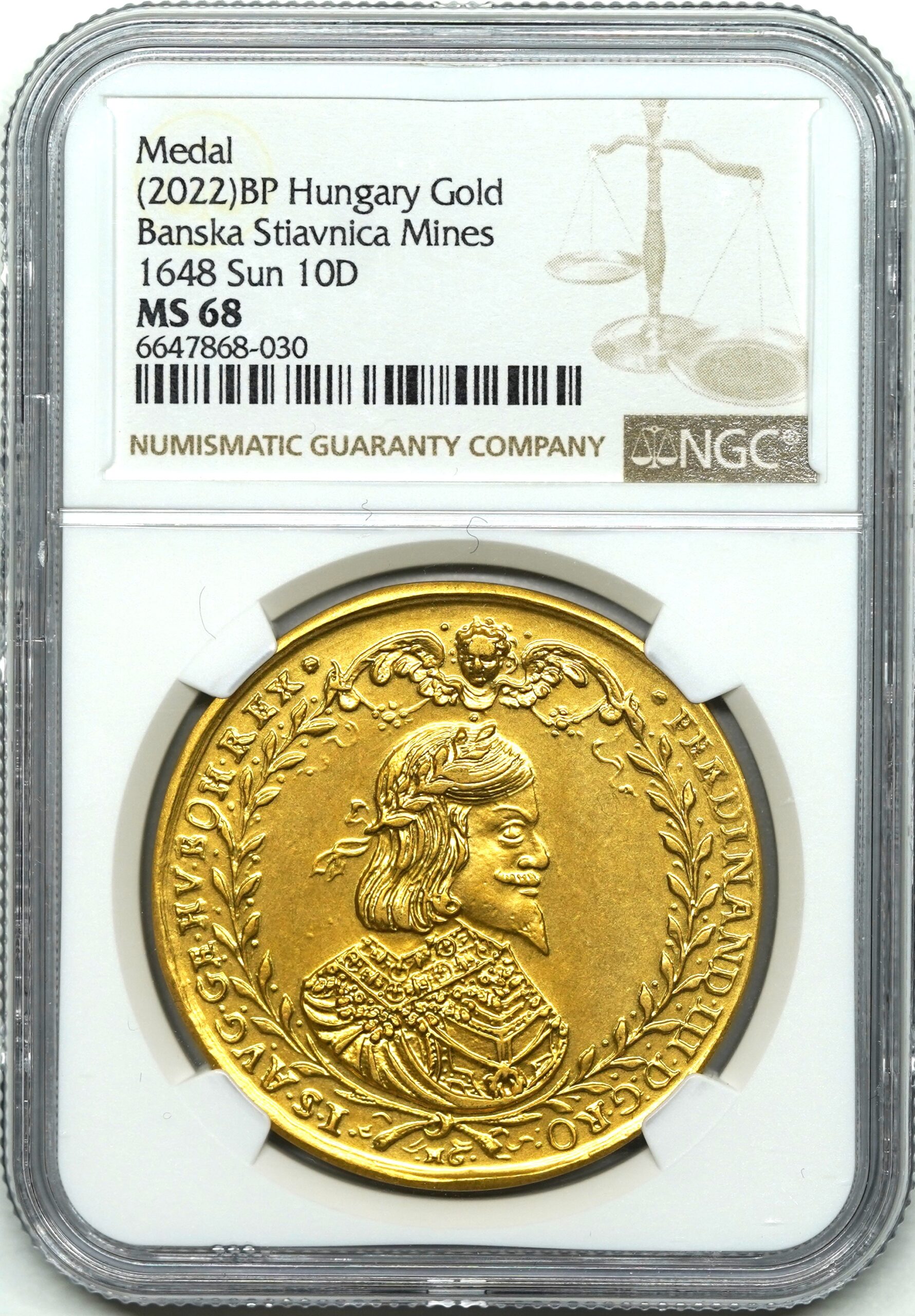 【Sold】【ハンガリー博物館監修】1648年(2022年) ハンガリー フェルディナンド3世 Sun 10ダカット リストライク MS68 NGC