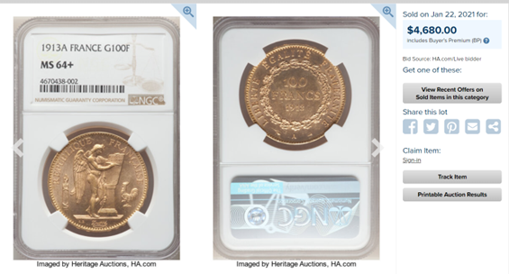 現在、MS64が市場に出てくることなく、ヘリテージでの1913年MS64は、2年前が最新となります。そのため、2年前と比較するとナポレオンもあがっており、100フラン金貨MS64が100万円以下であれば、十分将来性があるでしょう。
