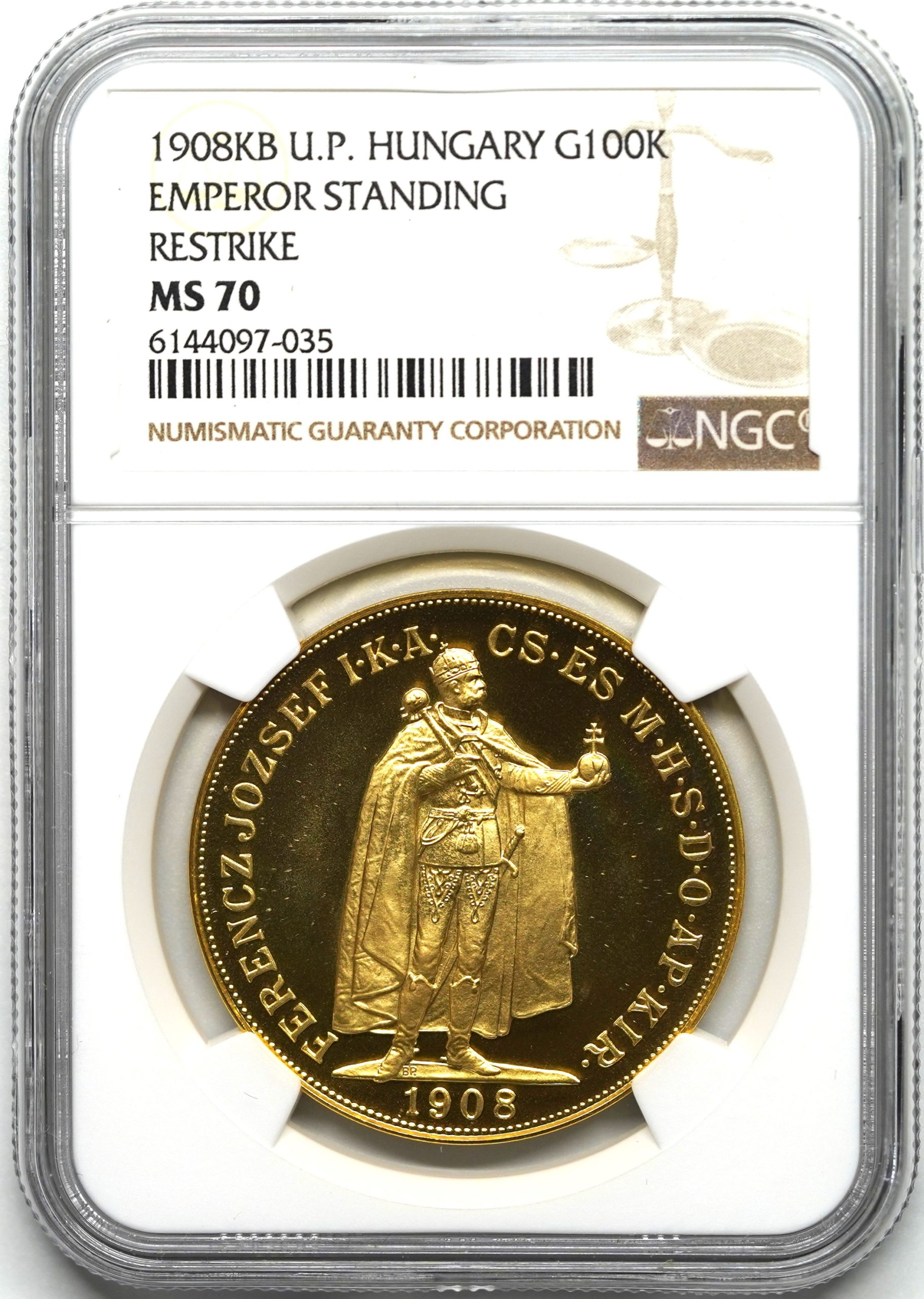 【Sold】【新規の方にお勧め】1908年 ハンガリー スタンディング 100コロナ金貨 リストライク MS70 NGC