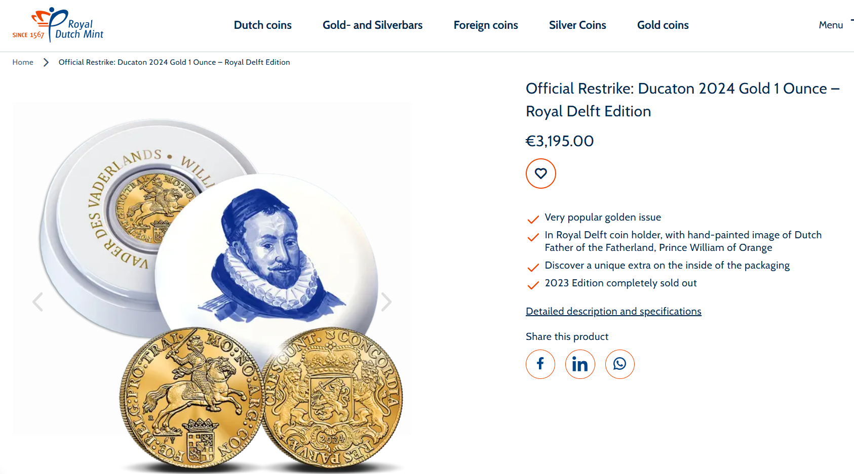 そして、オランダ造幣局の発売価格が下記のため、非常に安価です。