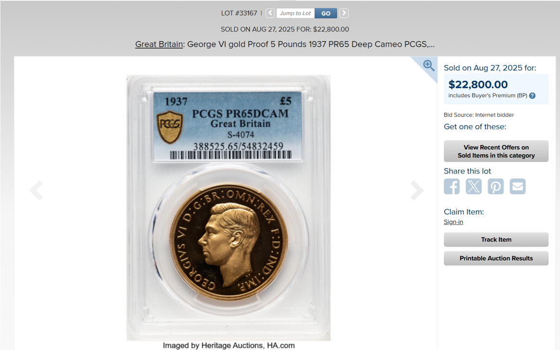 1937年 ジョージ6世 5ポンド金貨 PR65CAM PCGS