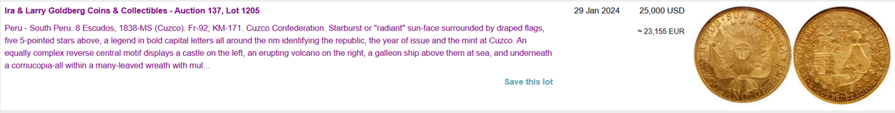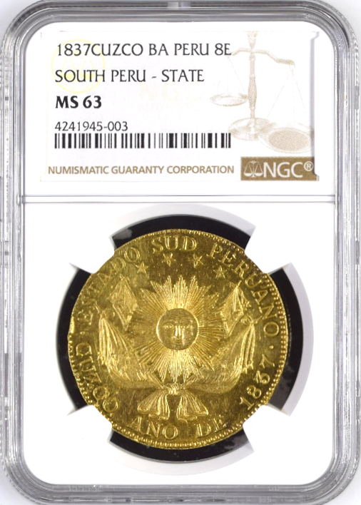 【委託販売】1837年 ペルー 8エスクード金貨 MS63 NGC