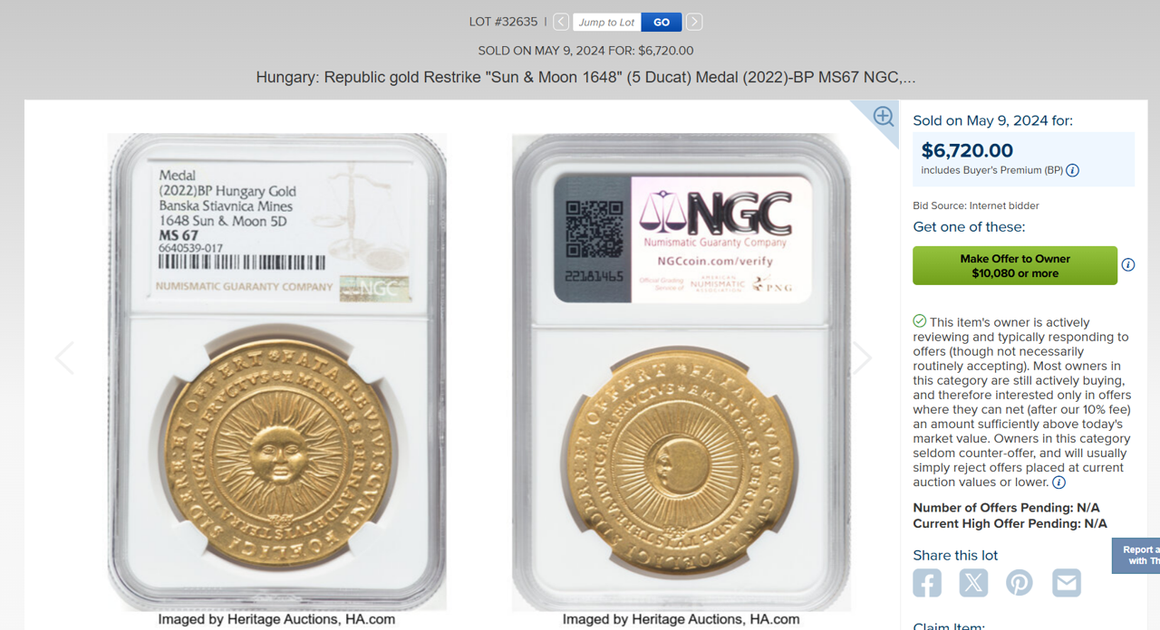 【Sold】【買いの1枚!!】1648年(2022年) ハンガリー フェルディナンド3世 Sun and Moon 5ダカット リストライク MS67 NGC