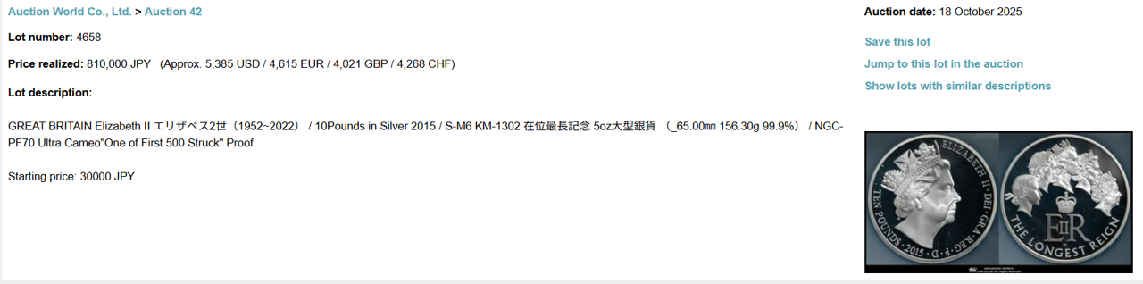 2015年にエリザベス2世最長在位を記念して発行された10ポンド銀貨となります。