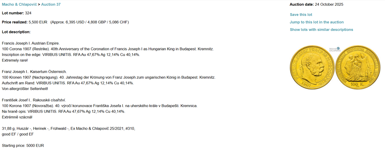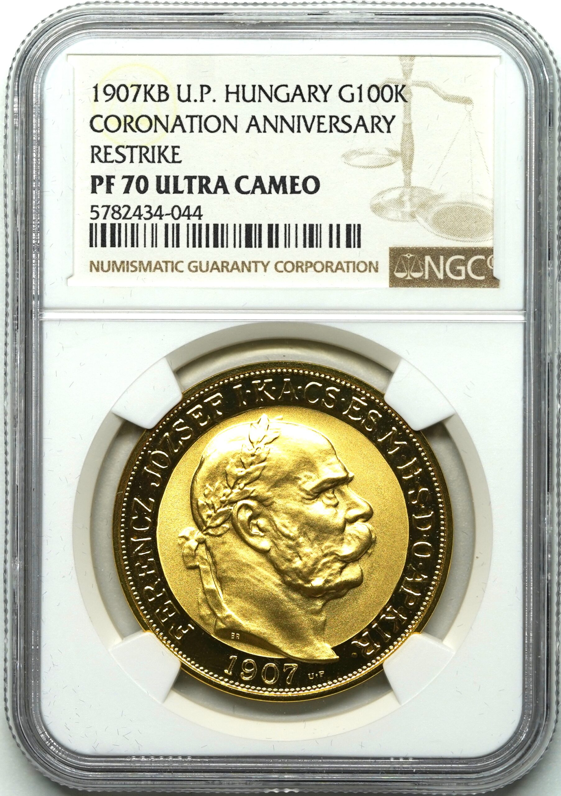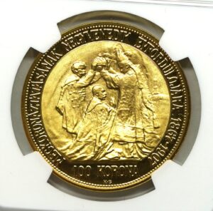 1907年に戴冠40年を記念して発行された100コロナ金貨 リストライクとなります。
