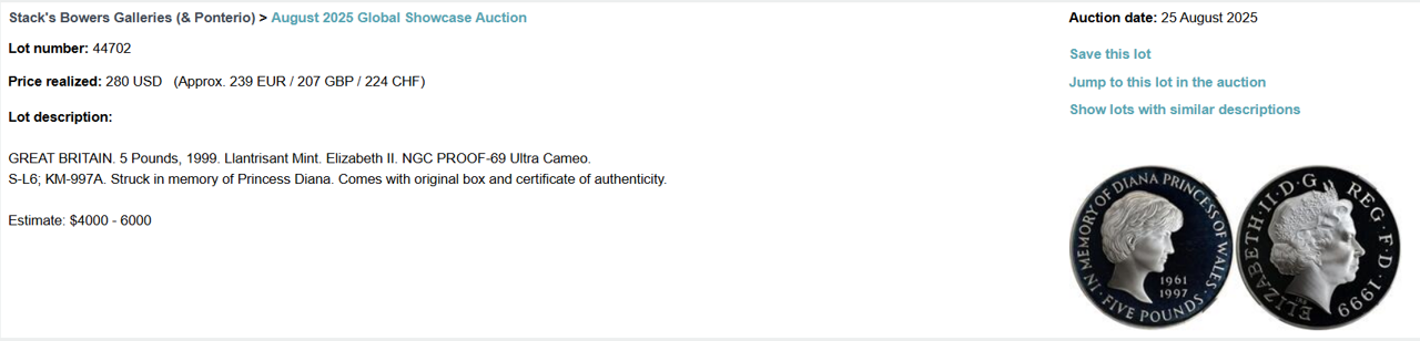 ダイアナ金貨の70鑑定が444万円で落札となるなど、かなりダイアナが伸びてきております。