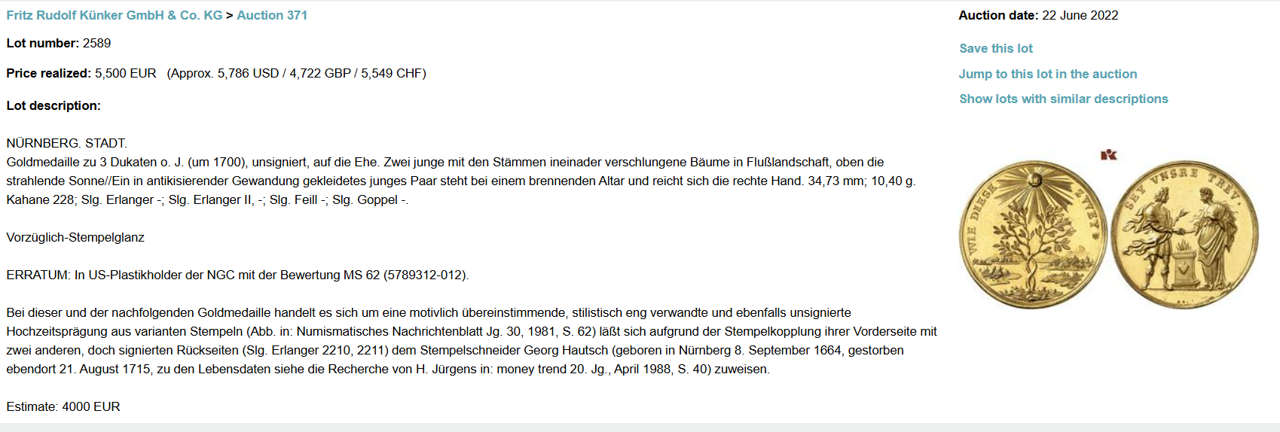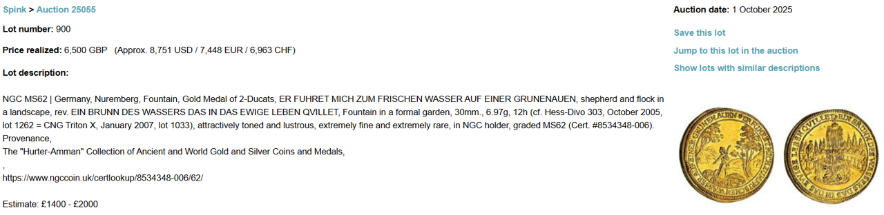 今回の3ダカットより小さいニュルンベルク2ダカット 金メダルMS62が2025年10月1日に175万円で落札されました。