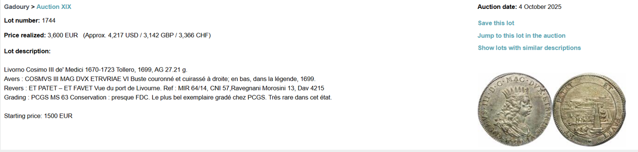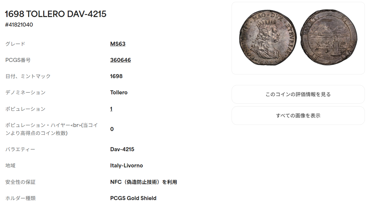 コジモ3世は、ルイ14世の従姉妹であるマルゲリータ・ルイーザと結婚しており、フランスコインを集めている方が今後注目する可能性もあります。