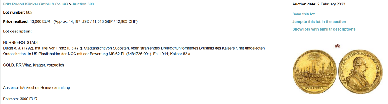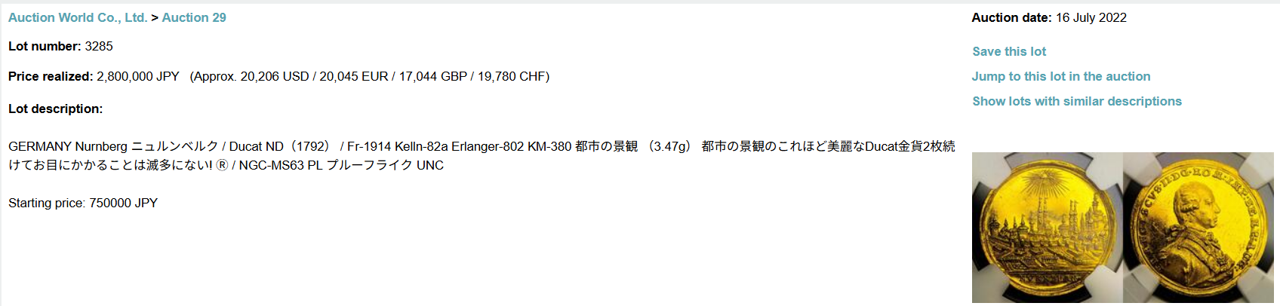 直近でも2023年とオークションに全く出てこなくなったニュルンベルク ダカット 都市景観金貨